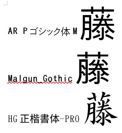 「AR Pゴシック体M」というフォントでは、標準字体の「藤」が出ますが、Malgun Gothic、HG正楷書体-PROでは、旧漢字に近い字体出すことが出来ました。