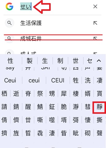 スマホでも、パソコンと同じく、「しずか」を入力すれば、変換候補に「靜」が出てきます。