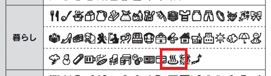 テプラでは、SR300では、「記号・絵」ボタンを押して、「絵」の中の「暮らし」の中に「♨」が用意されています。